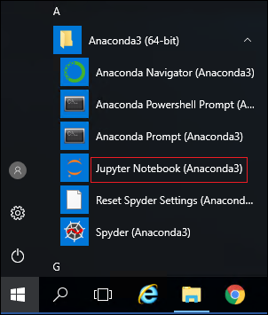 Jupyter fait partie des packages livrés avec Anaconda, on peut de la même manière ouvrir un Jupyter notebook en allant dans le menu démarrer de Windows et en sélectionnant l’option jupyter notebook (anaconda3) (@khichaneInstallationLenvironnementAnaconda2025)